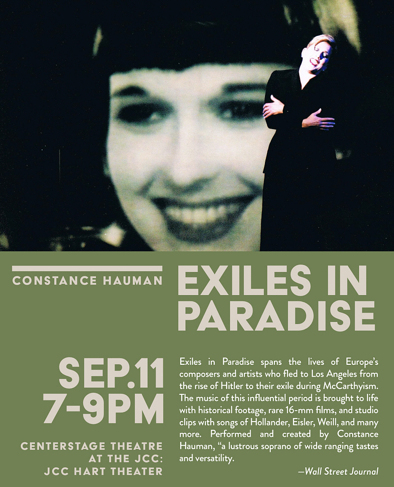 Constance Hauman is also the creator, writer, producer and performer of Exiles in Paradise, a documentary film/live performance recital with string quartet which spans the history, lives and Hollywood stories of Eastern Europe’s exiled composers from 1932–1949 in Los Angeles. Exiles was chosen to open the Jewish Museum in Berlin.